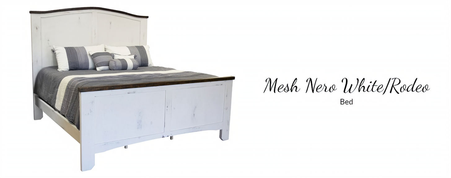Mesh Nero White / Rodeo gives any room a rustic barn like look. Features black cast iron hardware on nightstand, chest and dresser.